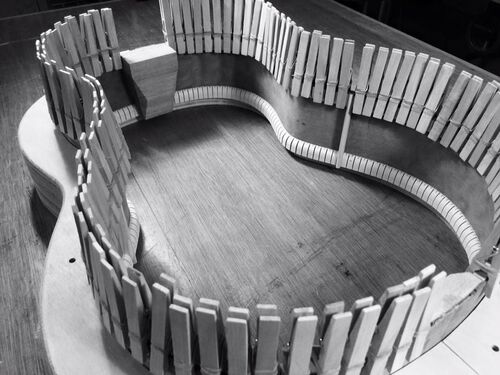 サイド板とトップ&バック板の「糊しろ」になる部分を作りました。 Lining(ライニング)、Liner(ライナー)、Kerfing(カーフィング)などと呼ばれます。 私はポートオーフォードシダーという、ヒノキ科の材を使います。 柾目の良材を用意します。長さは850m…