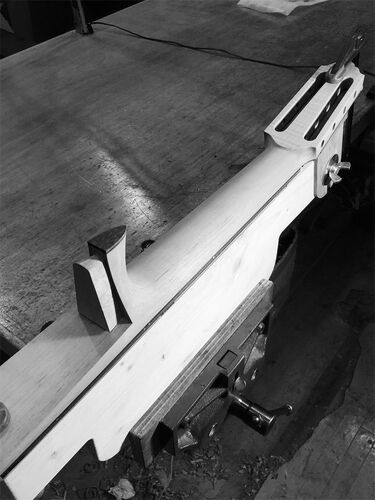 新作の7弦ギターのネックを削っています。RF(Raised Fingerboard)で、仕込みはドイツ式です。